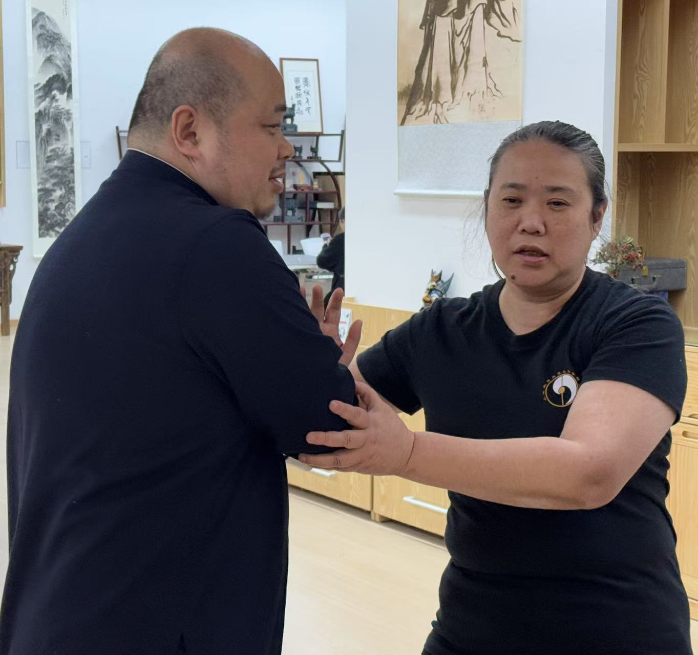 林黎:我接觸太極拳的歷程有些“誤打誤撞”。我以前工作非常忙,身體有一些神經衰弱、失眠的症狀。當時我有個朋友看到我的身體情況後,就帶我來找浦老師,想讓我通過學習太極拳來調養身體。浦老師在講拳的過程中,提到女子防身術,我想或許可以讓我還在唸幼兒園的孩子來練拳。結果浦老師説,孩子太小,還沒有打好文化根基,不宜練拳。