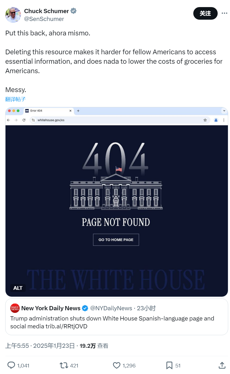 據瞭解,白宮官方網站的西班牙語界面在特朗普就任當天就已經被關閉。此外白宮在社交媒體平台“X”的西班牙文賬號也已經暫停使用。