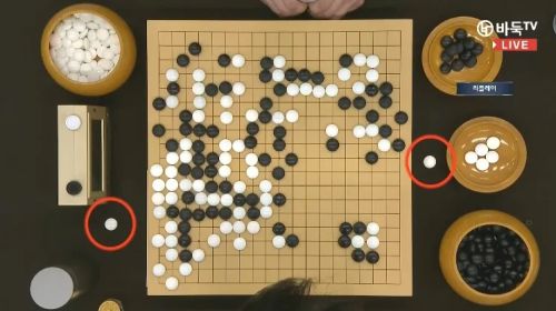第三盤中,柯潔未放回棋盤蓋的“死子”網絡截圖