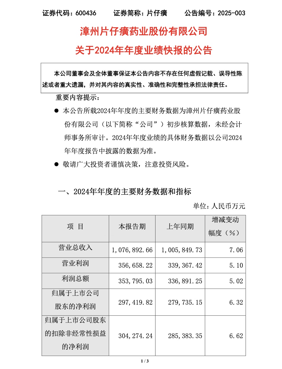 1月23日,漳州片仔癀藥業股份有限公司(以下簡稱“片仔癀”,600436.SH)發佈2024年業績快報,報告顯示,公司2024年實現營業總收入107.69億元,同比增長7.06%;歸屬於上市公司股東的淨利潤達到29.74億元,同比增長6.32%。儘管淨利潤仍實現了增長,但增速相比前幾年有所放緩。