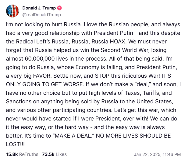 特朗普寫道:“我並不想傷害俄羅斯。我愛俄羅斯人,並且一直與普京保持着良好的關係……我們永遠不能忘記,俄羅斯幫助我們贏得了第二次世界大戰,在此過程中幾乎有6000萬人喪生。話雖如此,我還是要幫俄羅斯和普京一個大忙,因為俄羅斯的經濟正在衰退。”