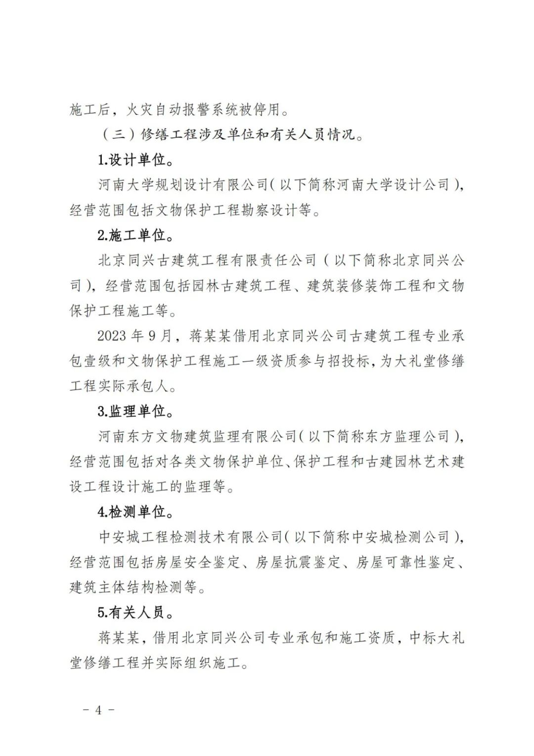 2024年5月2日,河南省開封市順河回族區明倫街85號河南大學明倫校區河南留學歐美預備學校舊址大禮堂發生火災,過火面積3410平方米,直接經濟損失2743.8萬元。經查,這是一起在文物修繕工程施工過程中,事發單位安全管理缺失,施工單位違法違規明火作業,監理單位放任失職,設計單位違規設計,屬地黨委、政府及有關職能部門、單位履職不到位而導致的生產安全責任事故。