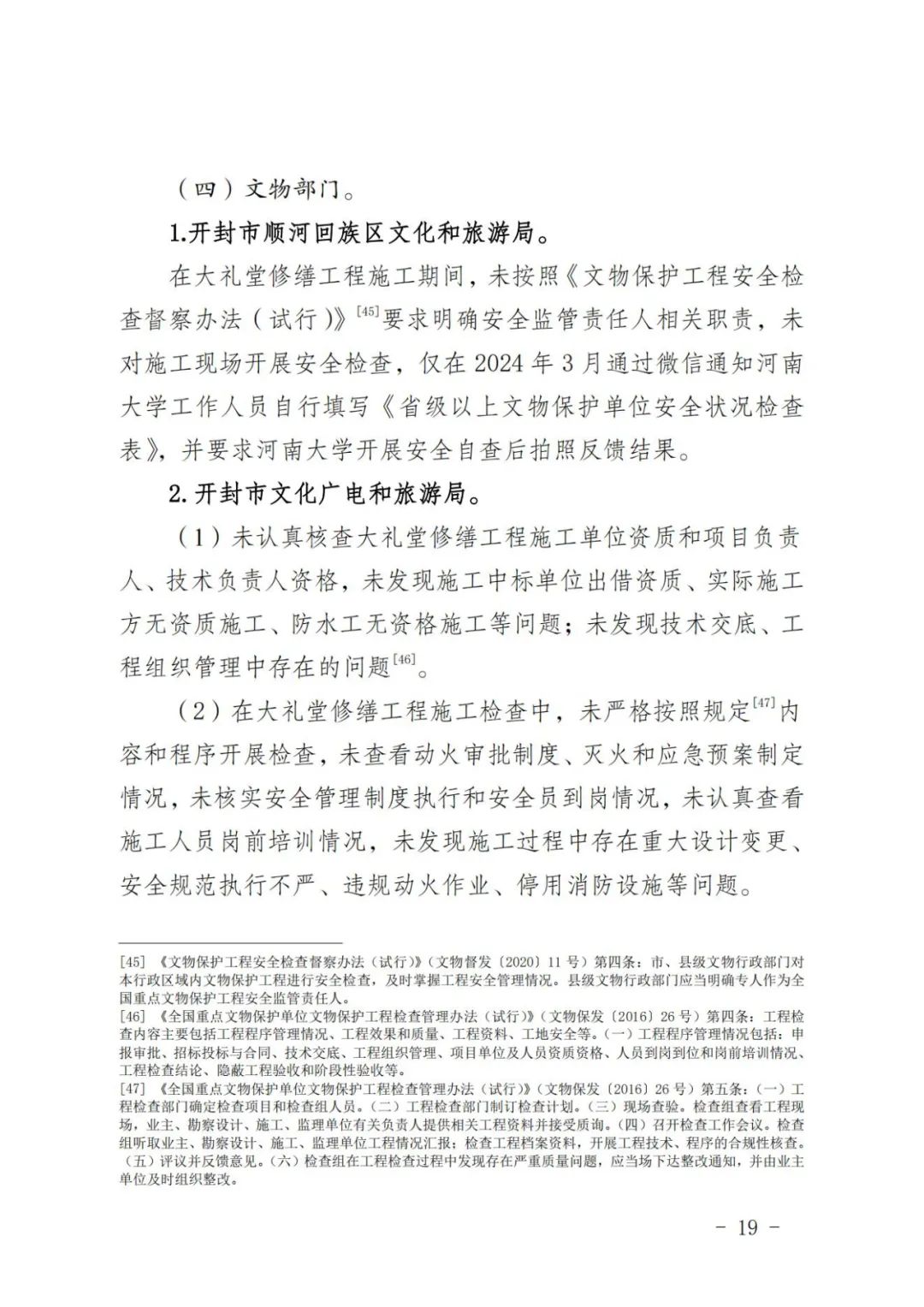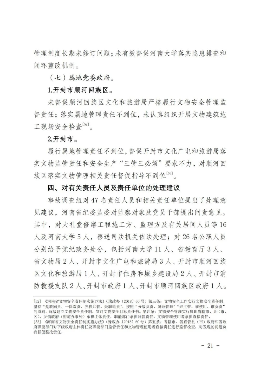 大禮堂修繕工程施工方、監理方、有關居間人員等16人因涉嫌犯罪,被公安機關立案偵查並移送司法機關依法處理。對河南大學、大禮堂修繕工程的設計、施工、監理、檢測單位及有關人員存在的違法違規問題,由有關部門依法作出行政處罰。