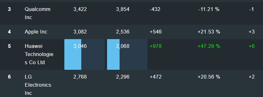 數據顯示,華為去年的專利授權數量同比增長47%,至第五名 IFI Claims公司網站