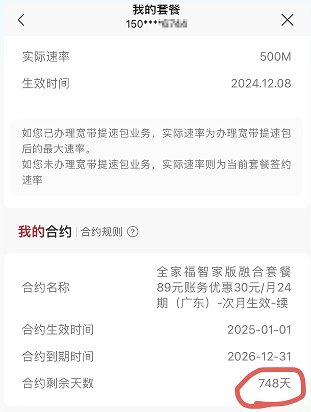 然而2024年12月12日,韓先生登錄中國聯通App查看個人賬户信息時,發現自己辦理的套餐竟是合約套餐,而合約到期時間為2026年12月31日。“仔細研究後才發現,這個合約套餐原價為119元,優惠30元后才是每月89/元,到期後費用會自動變為119元,到期前該套餐都無法更換。”