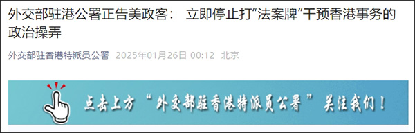 據微信公眾號“外交部駐香港特派員公署”1月26日消息,針對美國國會個別議員再次拋出所謂“香港製裁法案”,列出所謂評估制裁名單,威脅恫嚇特區政府官員、法官和檢察官,外交部駐港公署發言人表示強烈不滿和堅決反對。