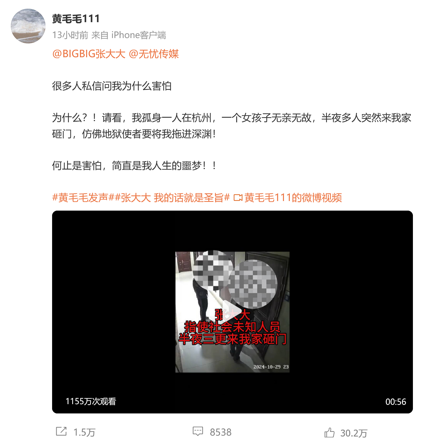@黃毛毛111 在相關爆料博文中@了男藝人張大大,並指其“派社會未知人員三更半夜上門砸門”。
