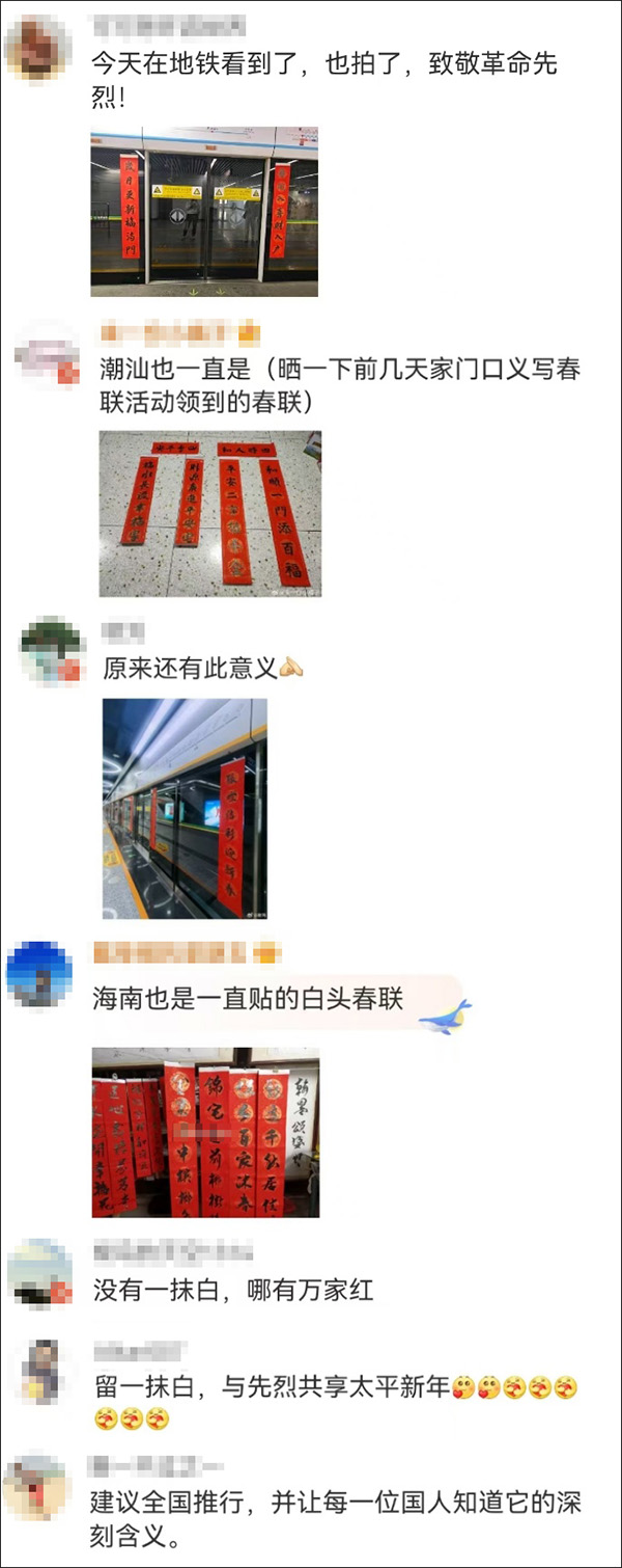 這一細節感動了不少網友,有網友曬出了自己拍到的白頭聯,也有網友留言稱,“與先烈共享太平新年”,“沒有一抹白,哪有萬家紅”。