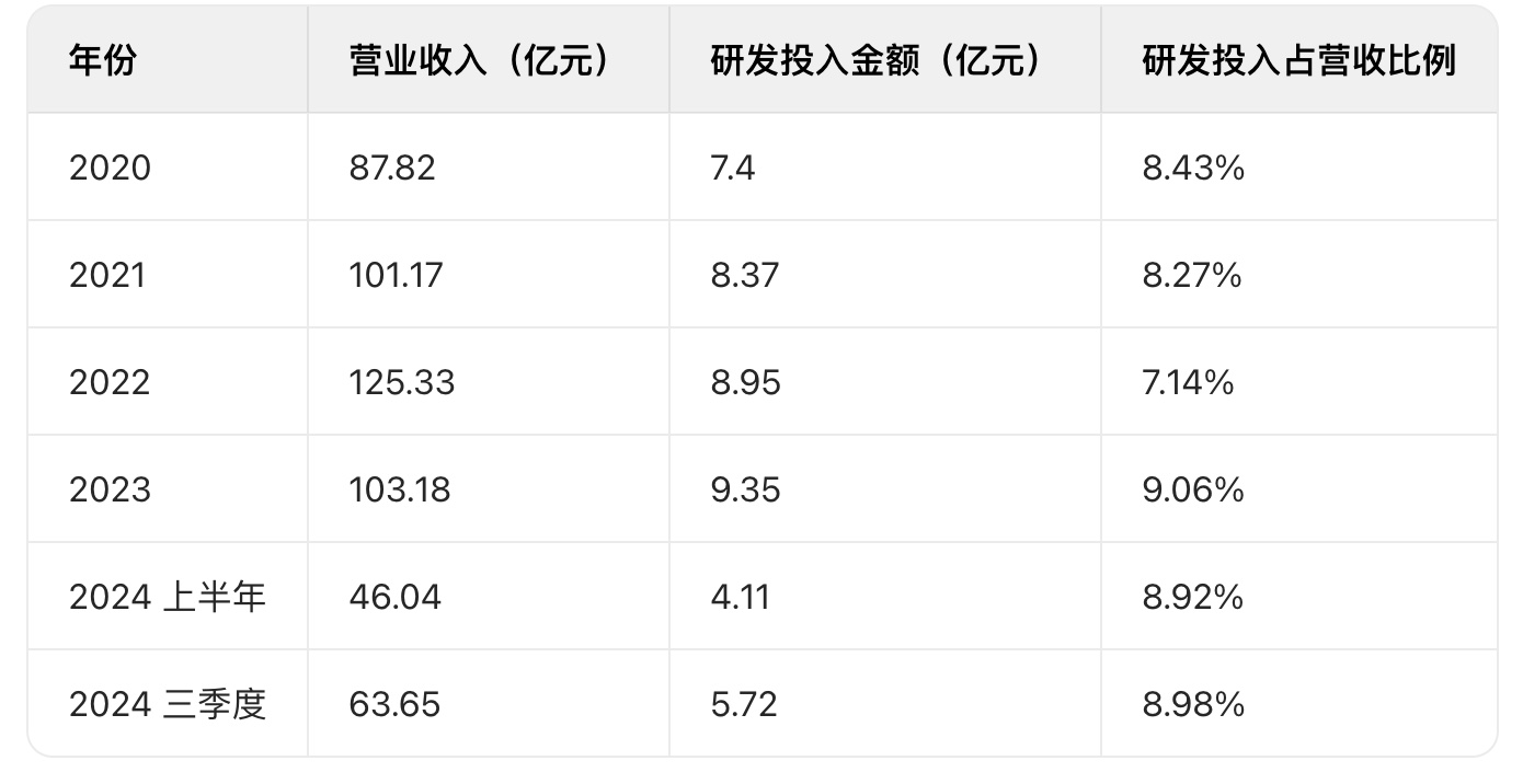 2021 - 2023 年,以嶺藥業研發投入持續增長,分別達到 8.37 億元、8.95 億元、9.35 億元,複合增長率超過 20%,總投入接近 40 億元。2024 年前三季度,以嶺藥業的研發投入達到 5.72 億元,佔營業收入的 8.98%,在同行業中仍處於領先地位。
