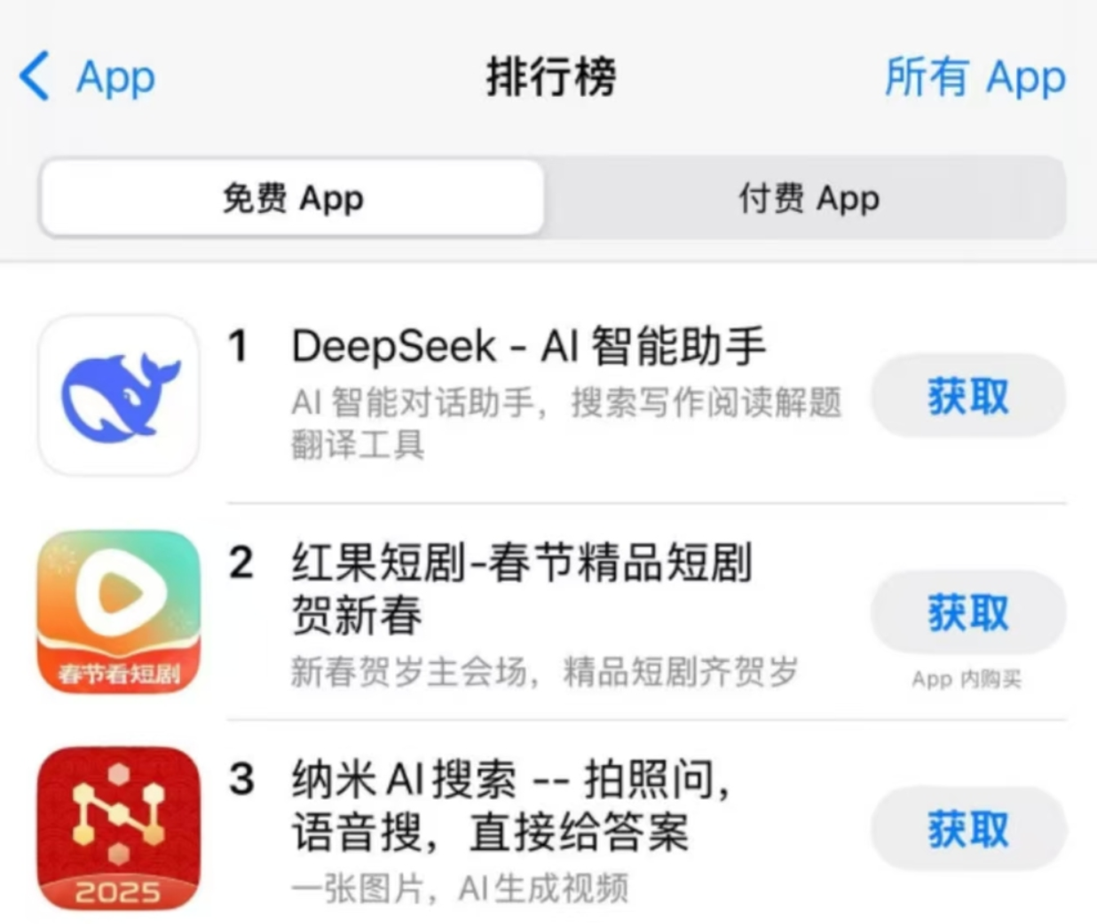 DeepSeek超越ChatGPT,登頂蘋果美國區免費APP下載排行榜