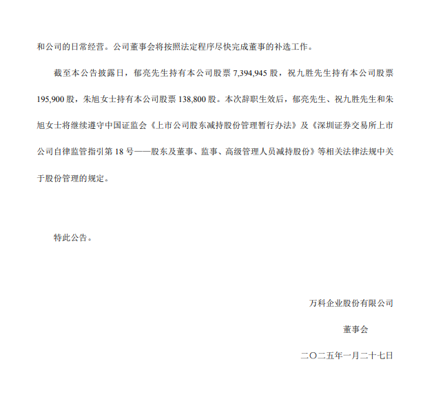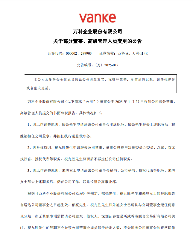 1月27日,萬科集團對外發布公告,宣佈因工作調整原因,鬱亮先生申請辭去公司董事會主席職務。鬱亮先生辭去上述職務後,將繼續擔任公司董事,並擔任執行副總裁職務。因身體原因,祝九勝先生申請辭去公司董事、董事會投資與決策委員會委員、總裁、首席執行官、授權代表等職務。祝九勝先生辭職後不再擔任公司任何職務。