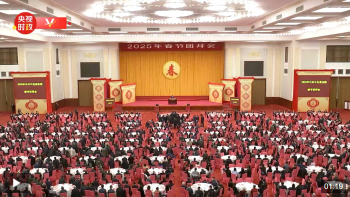 中共中央、國務院27日上午在人民大會堂舉行2025年春節團拜會。中共中央總書記、國家主席、中央軍委主席習近平發表講話,代表黨中央和國務院,向全國各族人民,向香港特別行政區同胞、澳門特別行政區同胞、台灣同胞和海外僑胞拜年。