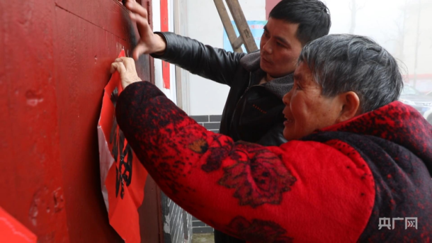 彭德良與70多歲母親貼春聯(央廣網記者 郇康新 攝)