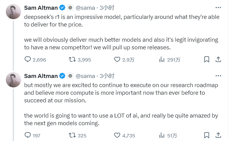 奧特曼稱:“DeepSeek-R1是一款令人印象深刻的模型,尤其是考慮到其性價比。顯然,我們會推出更好的模型,而且有新競爭對手出現確實令人振奮!我們會發布一些成果。”