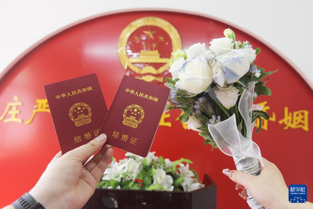 一對新人在民政局婚姻登記處領取結婚證後拍照留念。 資料圖:新華社
