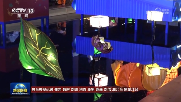 除夕夜,香港維多利亞港在五彩花燈的照耀下繽紛奪目,錦鯉、金魚在水上躍動,寓意年年有餘。大街小巷在五彩燈籠、桃花年桔的點綴下,充滿祥和歡樂的氣氛。
