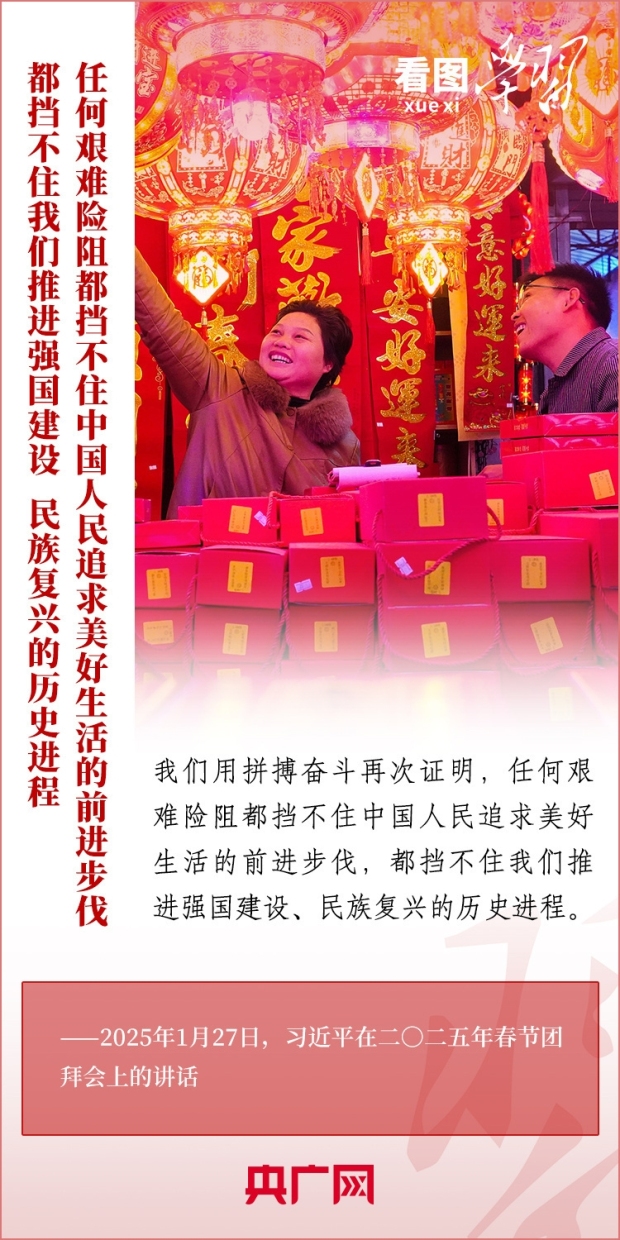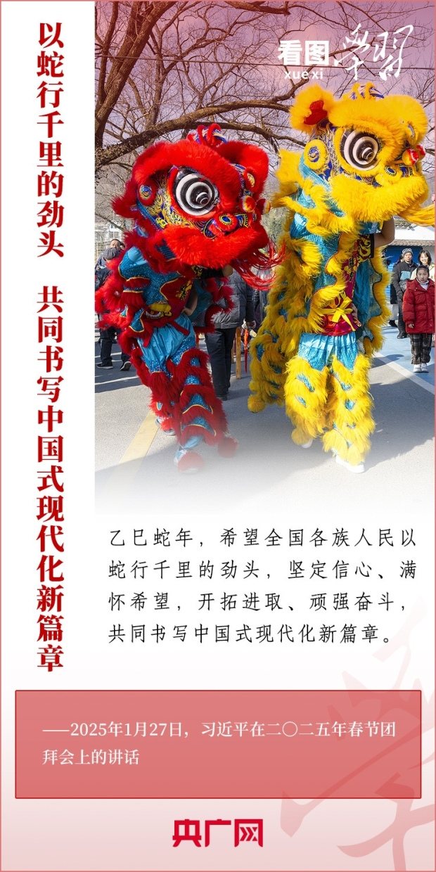 1月27日,中共中央、國務院在北京舉行春節團拜會,習近平總書記發表熱情洋溢的講話,向全國各族人民、港澳台同胞、海外僑胞拜年並致以新春祝福。總書記在講話中深情回顧過去一年中國式現代化取得很不平凡的發展歷程,“希望全國各族人民以蛇行千里的勁頭,堅定信心、滿懷希望,開拓進取、頑強奮鬥,共同書寫中國式現代化新篇章。”一起來學習!