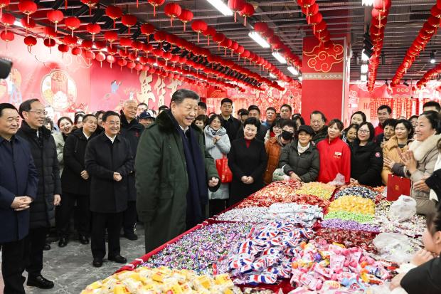 △2025年1月23日,習近平總書記在遼寧瀋陽大東副食品商場考察時,同店主和顧客親切交流,向大家致以新春祝福。