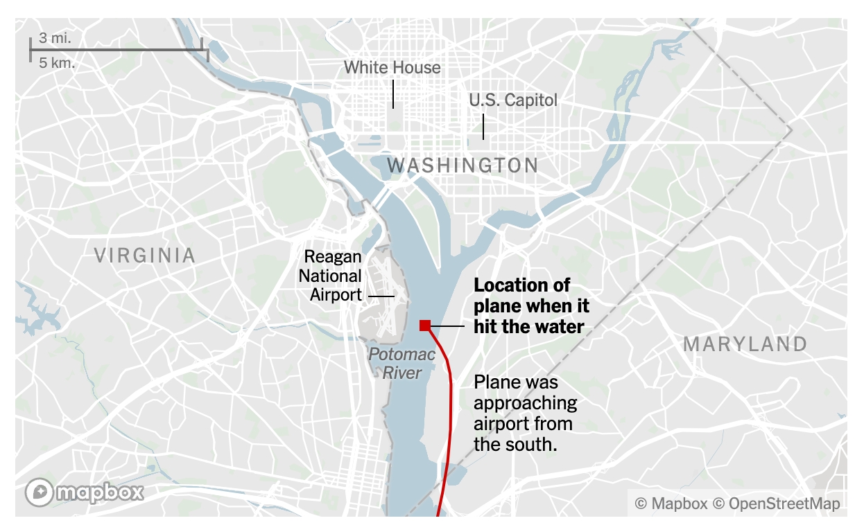 1月29日晚,美國太平洋西南航空公司一架龐巴迪CRJ700支線噴氣式客機在首都華盛頓里根國家機場降落過程中,與一架軍方“黑鷹”直升機相撞後墜河。目前已有已有超過30具遇難者遺體被找到。搜救行動仍在進行中。