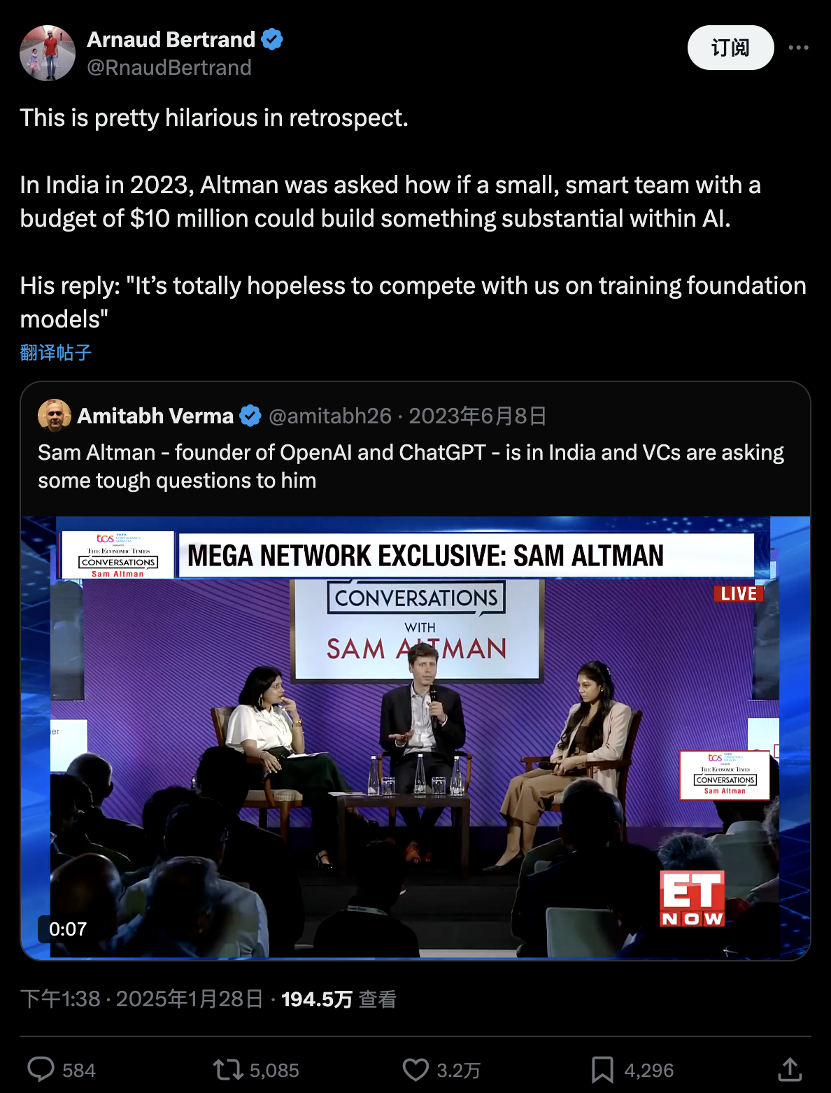 法國企業家、社交媒體X平台上的著名意見領袖阿諾德·貝特朗(Arnaud Bertrand)不僅轉發分享了這段視頻,還重複寫下了奧特曼的回答,並寫道:“回想起來,這真是太滑稽了。”