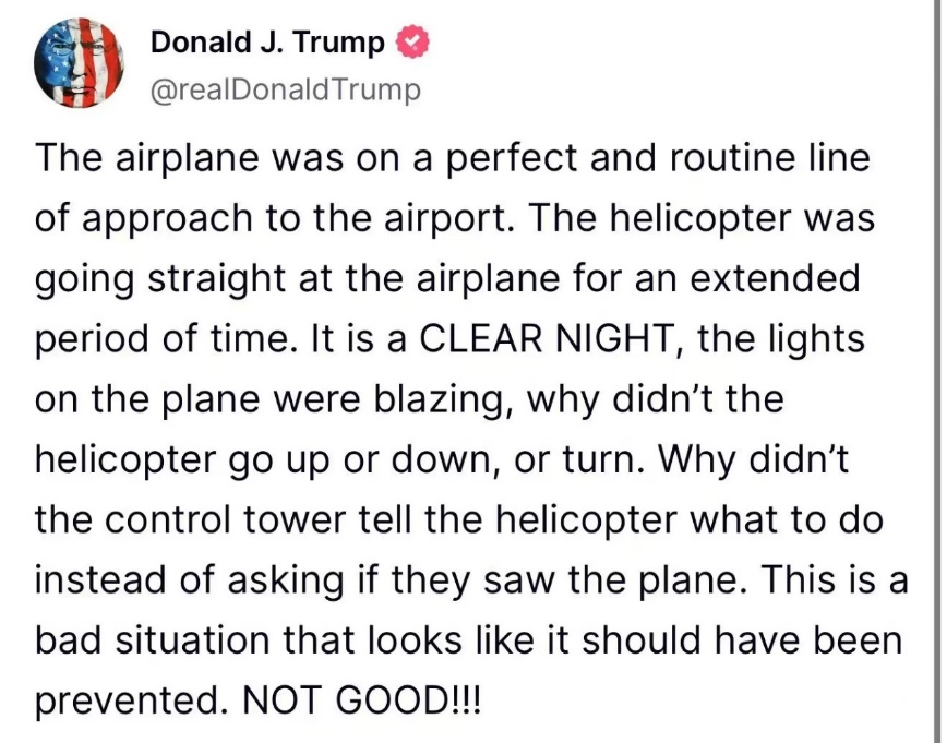 事故發生後,剛剛“二進宮”上任的美國總統特朗普就在他的私人社交媒體“真相”上炮轟這起事故。在推文中,特朗普總統稱當時天氣很好、能見度極佳,沒有理由看不到那架CRJ飛機;他很不解為什麼“黑鷹”沒有看到、空管沒有要求避讓,這本該是一起可以預防的事故。