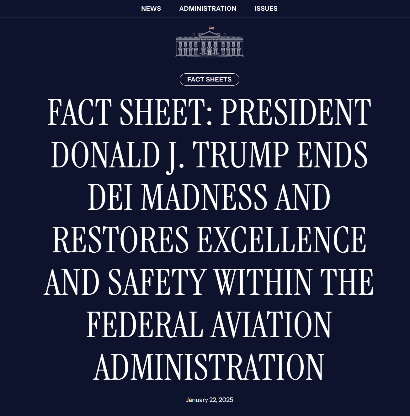 FAA的DEI項目是否讓一羣不適合人羣進入FAA工作我們無法下結論,但是特朗普上台後確實簽署了總統令,結束了FAA的DEI政策,並準備大刀闊斧地裁撤不適合人員。而考慮到里根國際機場的空管工作是由FAA負責,MAGA派和民主黨都有話説了,MAGA派認為是拜登四年的DEI毀了FAA導致事故發生,而民主黨則稱是特朗普的裁員威脅導致人心惶惶工作失誤。