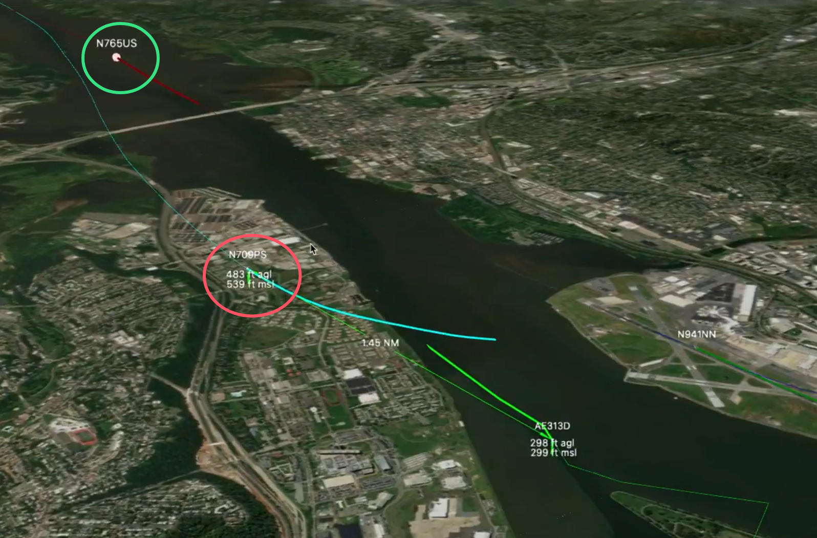目視飛行的“黑鷹”飛行員極有可能將遠處的N765US(綠圈)當做塔台所説的CRJ,而忽視了紅圈中真正的CRJ