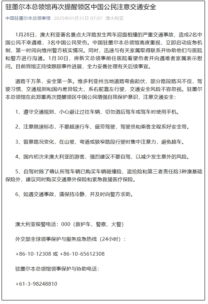 微信公眾號“中國駐墨爾本總領事館”消息, 1月28日,澳大利亞著名景點大洋路發生兩車迎面相撞的嚴重交通事故,造成2名中國公民不幸遇難,3名中國公民受傷。中國駐墨爾本總領館高度重視,立即啓動應急機制,第一時間向維州警方核實情況。同時,迅速與有關家屬取得聯繫並協助他們與醫院和警方進行溝通。1月30日,房新文總領事前往醫院看望傷者並向遇難者家屬表示慰問。目前我館正持續跟蹤事件進展,全力妥善處理有關後續事宜。