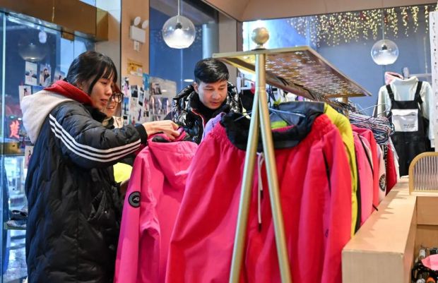 2025年1月23日,遊客在湖北神農架林區木魚鎮街邊一家店鋪挑選雪具雪服。自然天成的地理環境造就豐富的冰雪資源,也給當地運動裝備銷售、租賃行業帶來了商機。