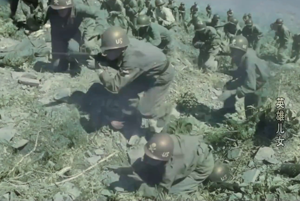 經典一幕就是王成(劉世龍 飾)英勇堅守陣地時,美軍士兵像“戰爭機器”一樣密密麻麻逼近高地,聽到王成一聲“為了勝利,向我開炮!”後嚇得抱頭鼠竄,潰不成軍。