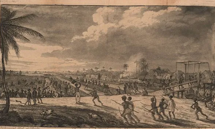 描繪1823年英國殖民地 Demerara-Essequibo(今圭亞那)黑奴與殖民者軍隊鬥爭的畫 維基百科