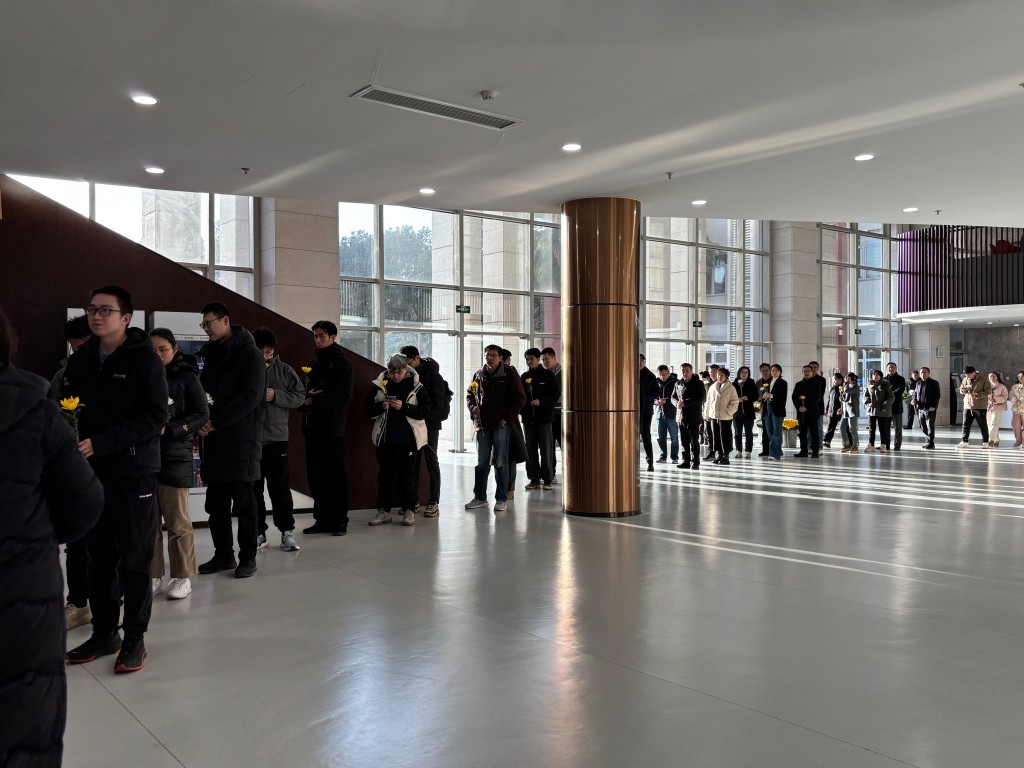 2月7日16時30分,澎湃新聞記者在上海交大閔行校區木蘭船建大樓一樓大廳看到,人羣在黃旭華院士的追思活動現場排起長隊。師生在追思活動入口處可領一支鮮花,分批進場後,默哀並向黃旭華院長的肖像三鞠躬,而後一一敬獻鮮花。