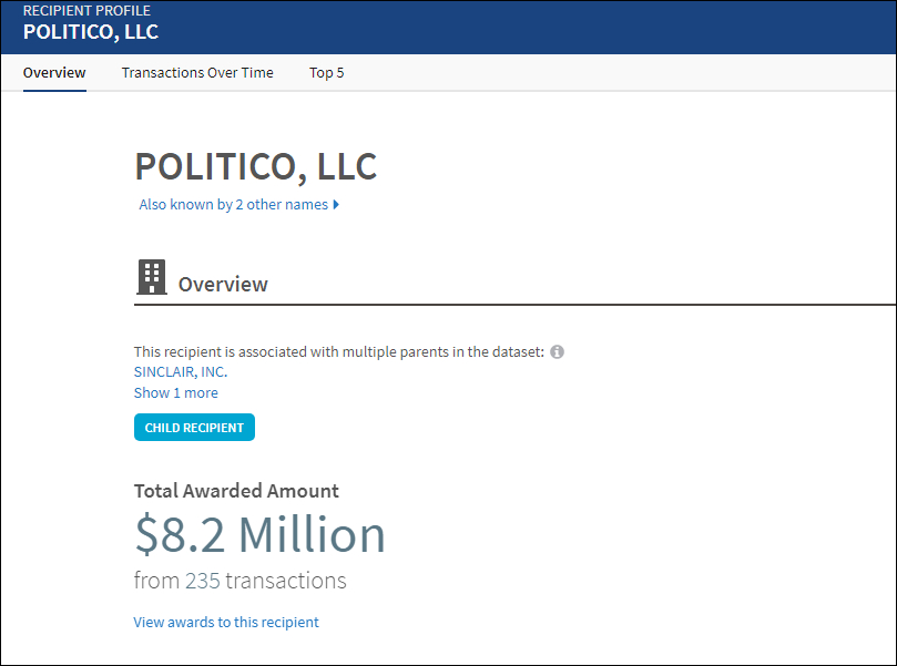 USAspending.gov顯示,過去12個月,聯邦政府機構向Politico支付了820萬美元。 網站截圖