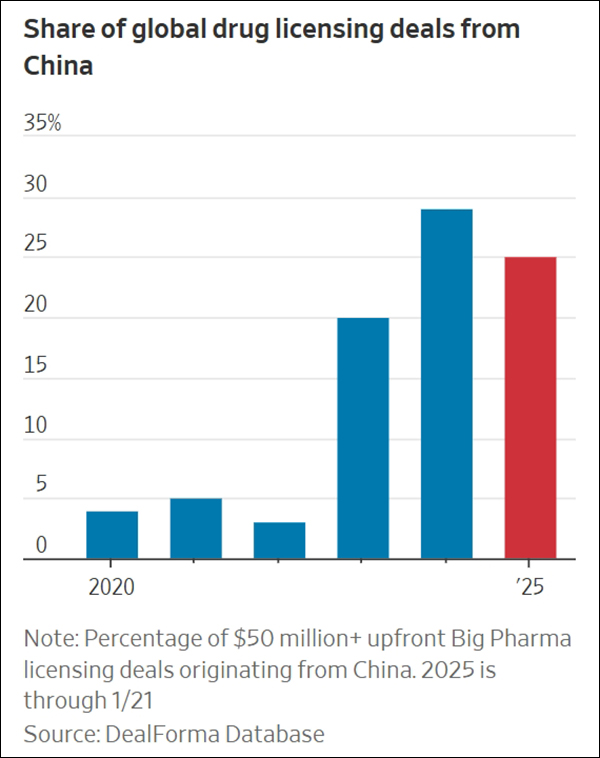 2020年至2025年,全球大型製藥公司的授權交易中來自中國生物技術公司的比例變化趨勢圖,2025年為截至1月21日的數據。 《華爾街日報》製圖