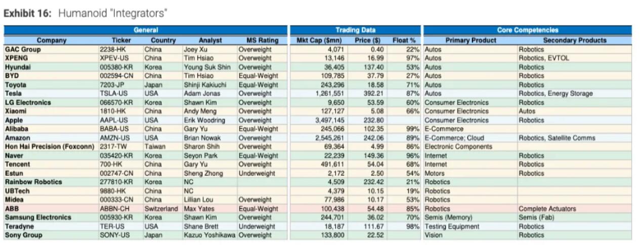在第三核心環節“集成”中,大摩則將汽車、消費電子公司以及互聯網和傳統的機器人公司,共計全球22家公司分類其中。