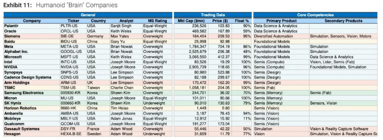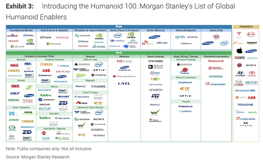 近日,摩根士丹利(Morgan Stanley)發表了一份梳理全球人形機器人領域上市公司的百強名單顯示,絕大部分由中美兩國公司所佔據,且兩國在各環節互有優勢。