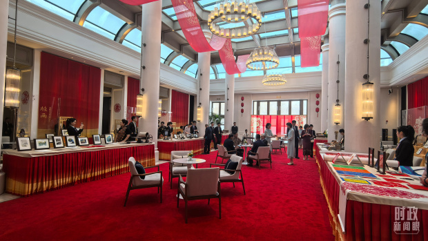 △歡迎宴會開始前的黑龍江非物質文化遺產展示。(總枱央視記者史偉、央廣記者馬喆拍攝)