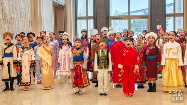 △歡迎宴會現場,少年兒童正在合唱黑龍江民歌《烏蘇裏船歌》。(總枱央視記者閆耀東拍攝)