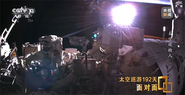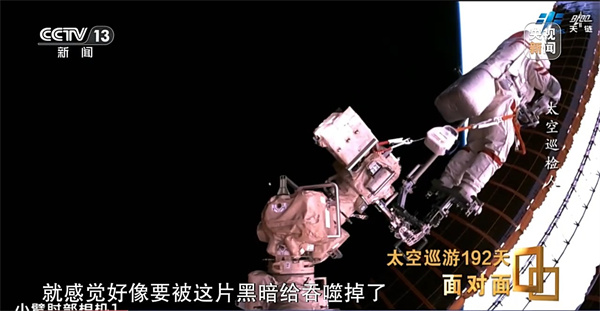 李廣蘇:爬時間久了之後手很累,因為手腕這塊一直在持續地在發力,持續時間長了之後,需要停下來休息休息,再繼續進行轉移。特別是到了陰影區,陽照區還好,陽照區能看見空間站,包括地球看着比較踏實,比較安心。但是到了陰影區以後,你要不開燈,你就感覺下面深不見底,深邃的那種黑。