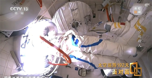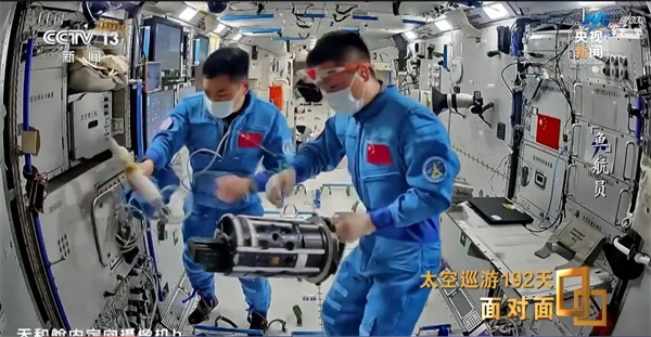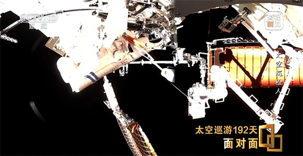 李聰:當時我就自己琢磨,我能不能我先往後走,我讓自己身體蕩起來,利用自己的慣性去給它推進去,當時我就想嘗試一下。我就小範圍地小幅度地我去弄一下,我發現有效果,第一次幅度有點小,第二次我就加大一下幅度,這時候指令長就在我旁邊,他給我指揮還差多少,還差多少,第三次一下進去了,就是插到底了。那麼這個力道,也許裝第二個的時候還是兩次,後邊裝的時候基本上一次性到位。我跟十九乘組去交流的時候,我説你們可以在艙內着服訓練的時候,在軌訓練的時候可以試一下,我盪到底蕩一個什麼樣的感覺可以把它插緊。
