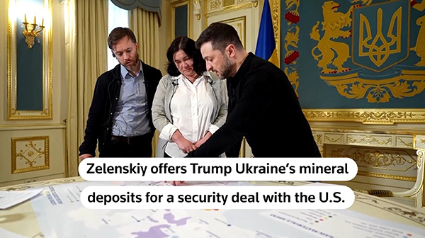 在美國總統特朗普稱希望烏克蘭用稀土礦換取援助後,烏克蘭總統澤連斯基在接受路透社採訪時展示了曾被列為機密的烏稀土礦和其它重要礦產的分佈圖,並表示願意交易,“美國人提供的幫助最多,因此應該獲得最多的好處”。