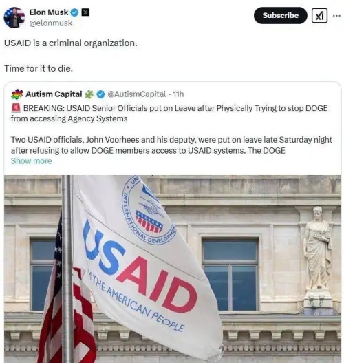 政府效率部負責人馬斯克在X上發文稱,美國國際開發署“是一個犯罪組織,是時候讓它消亡了”網絡截圖