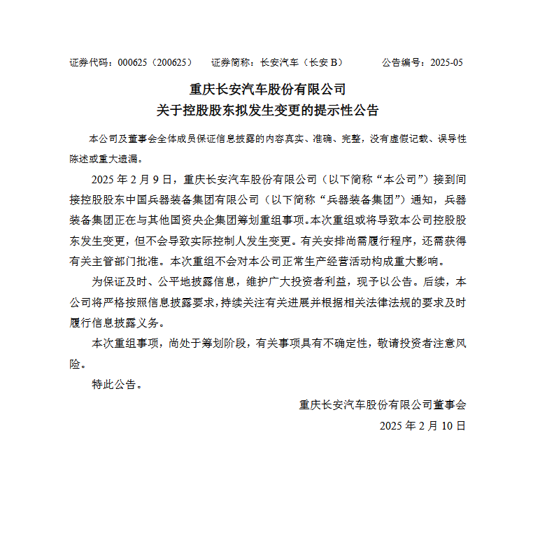 同日,重慶長安汽車股份有限公司發佈公告,稱接到間接控股股東中國兵器裝備集團有限公司通知,兵器裝備集團正在與其他國資央企集團籌劃重組事項。本次重組或將導致本公司控股股東發生變更,但不會導致實際控制人發生變更。有關安排尚需履行程序,還需獲得有關主管部門批准。