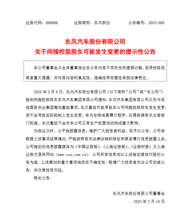 2月9日,東風汽車股份有限公司發佈公告,稱接到間接控股股東東風汽車集團有限公司通知,東風汽車集團正在與其他國資央企集團籌劃重組事項。本次重組可能導致東風股份的間接控股股東發生變更,但不會導致實際控制人發生變更。相關安排尚需履行程序,並需獲得有關主管部門批准。