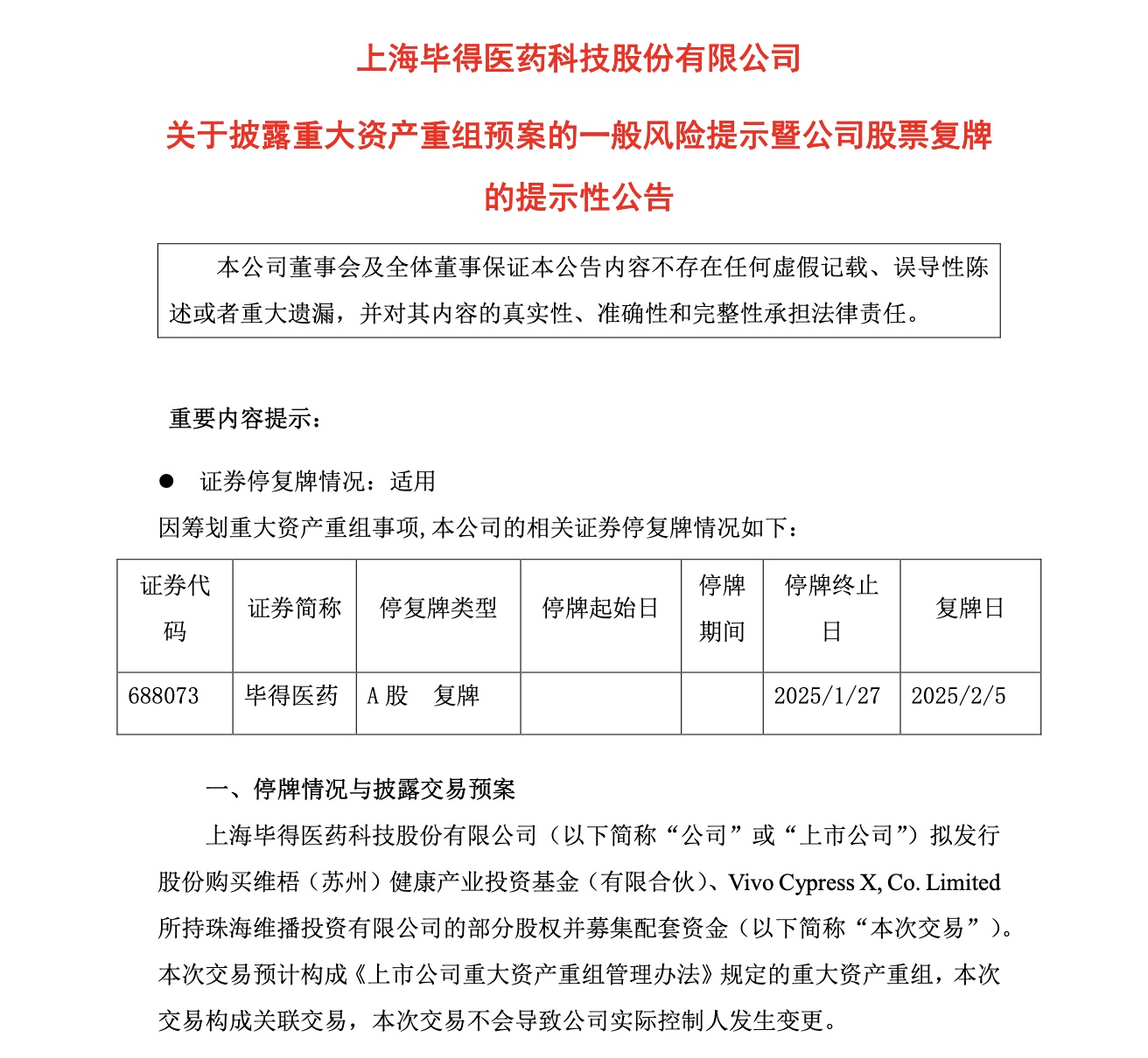 市場關注的焦點在於畢得醫藥之前公佈的重大資產重組預案。根據該預案,公司計劃發行股份購買維梧(蘇州)健康產業投資基金(有限合夥)和Vivo Cypress X, Co. Limited持有的珠海維播投資有限公司部分股權,並募集配套資金以實現對目標公司Combi的控制。