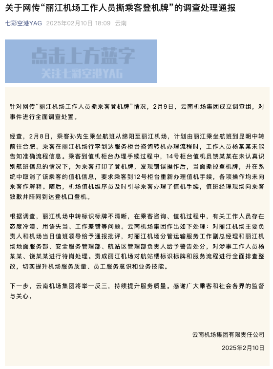 據微信公眾號“七彩空港YAG”消息,2月10日,雲南機場集團有限責任公司發佈關於網傳“麗江機場工作人員撕乘客登機牌”的調查處理通報。通報稱,對涉事工作人員楊某某、饒某某進行待崗處理;對麗江機場主要負責人和機場當日值班領導給予通報批評;並對地面服務部、安全服務管理部等多部門負責人給予警告處分。