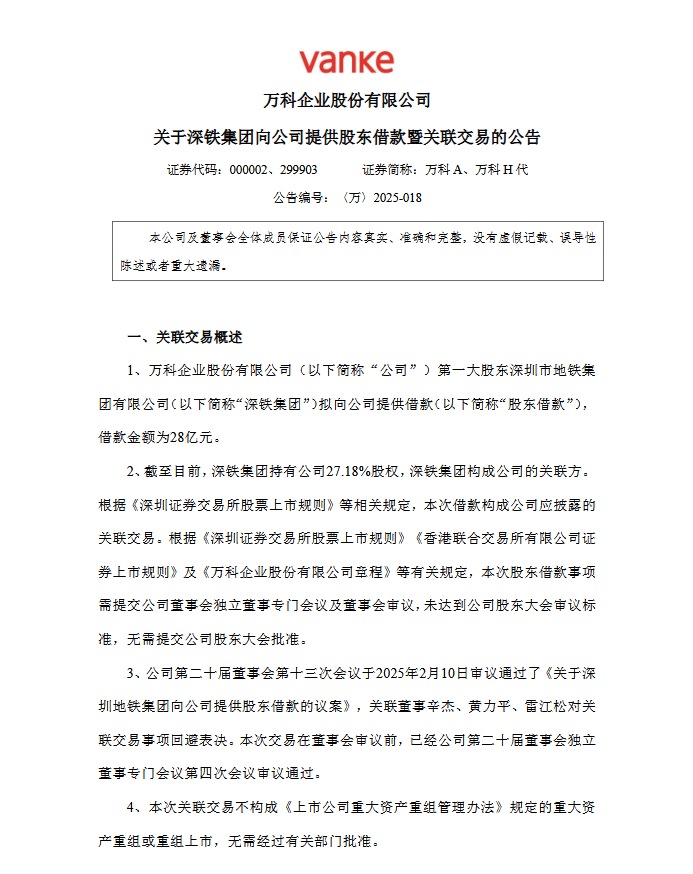2月10日,萬科A公告稱,公司第一大股東深圳市地鐵集團有限公司擬向公司提供28億元股東借款,借款利率為年化2.34%,低於全國銀行間同業拆借中心公佈的1年期LPR。萬科企業將提供價值40億元的萬物雲股票作為質押擔保,質押率設定為70%。該公司稱,本次借款用於償還公司在公開市場發行的債券本金與利息。