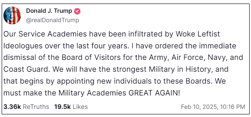 當地時間2月10日,美國總統特朗普在其創建的“真實社交”平台上發文表示,美國軍事學院近來被左派“覺醒”運動嚴重滲透,他已下令立即解散陸軍、空軍、海軍和海岸警衞隊的軍事學院的監事會(Board of Visitors)。