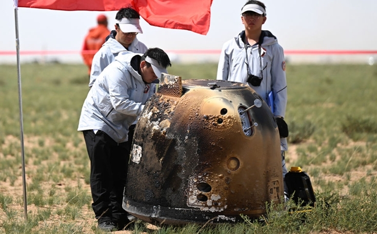2024年6月25日14時7分,嫦娥六號攜帶月球背面樣品成功返回地球。 新華社