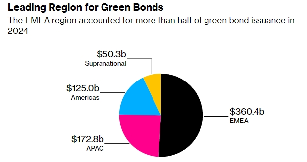 2024年歐洲、中東和非洲地區(EMEA)的綠色債券發行量佔比超過一半,其後是亞太地區(APAC)。彭博社製圖